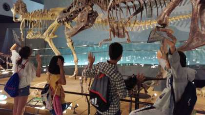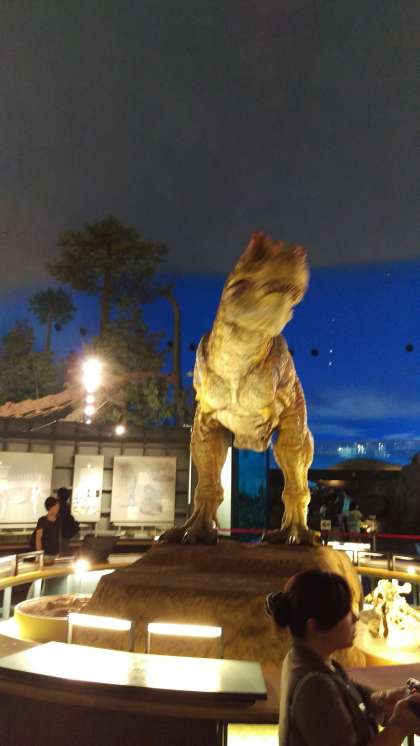 大きな恐竜の展示にビックリしています。