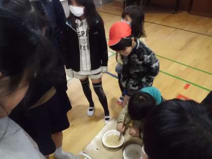 給食委員会の取組で中間休みに「豆つかみ大会」を実施しています。たてわり班ごとに集まり,順番に豆をつかんでいます。6年生が中心となって盛り上がっていました。