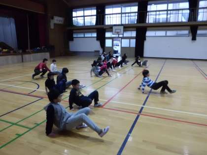 5年生は来年の山科川駅伝に向けて,4月から朝練をしています。天気の悪い日は体育館でトレーニング。今回は様々な走り方でダッシュしました。いろいろな運動を経験して走りが速くなりましょう。
