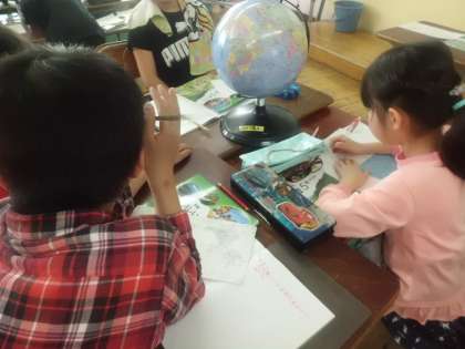 社会の時間に世界にはいろいろな大陸や海があることを学習しました。ユーラシア大陸やアフリカ大陸,オーストラリア大陸などがあり,それぞれの大陸にどんな国があるのかを調べています。地図にぎっしりと国名がかかれている児童の姿も見られました。