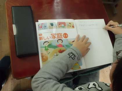 5年生になり初めて経験する授業「家庭科」がありました。家庭科で学習していくことは「衣・食・住」であることをしりました。「衣」では,ぬい方を学習したり着方を学習したりします。「食」では,調理実習をしたり栄養バランスを考えたりします。「住」では,心地よく過ごす方法を学習していきます。みんな楽しみにしている様子でした。