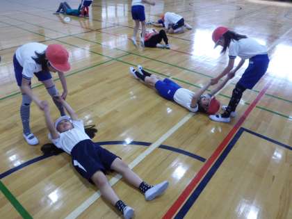 体育では「体ほぐしの運動」という単元で,手軽な運動を行い,体を動かす楽しさや心地よさを味わっています。その中で自分の体の状態に気付いたり,体の調子を整えたり,仲間と豊かに交流したりしています。今回は二人組でリラクゼーション・ストレッチをしました。ゆっくりのばしたり,手や足をぶらぶらさせたりしました。「気持ちいい」「すっきりした」という声が子どもたちから聞こえてきました。