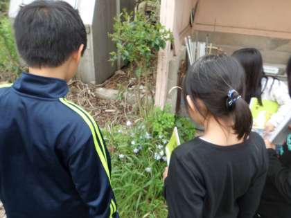今日も理科で畑やビオトープで生き物の観察をしました。今回は1年間観察する生き物を決め,じっくり観察しました。さぁ,季節が変わるとどうなるでしょうか。楽しみですね。