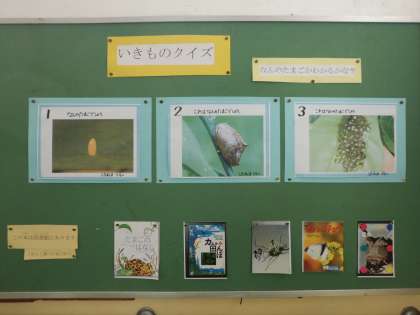 クイズ!「なんの生きもののたまごかな…?」写真を見て当てましょう。それに関係する生きものの本も紹介しています。詳しいことを知るために図書館に調べに来てください。