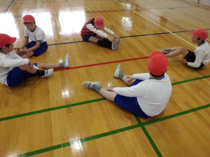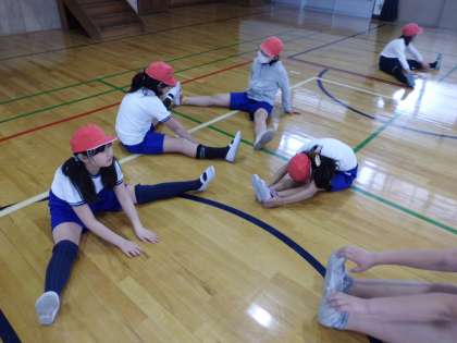 体育科の体ほぐしの中でストレッチをしました。体を曲げることでどこが伸びているのかをグループごとに確認していました。「痛いけど気持ちいい」という声が聞かれました。