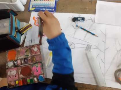 絵の具で色を塗り始めている子もいます。