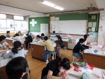 家庭科の学習で初めて家庭科室を使いました。教室とは机の配置が違うので,座り方も違います。お互いが向き合った状態なので,なんだかそわそわした様子でした。それでも,前を向いて先生の話をしっかりと聞くことができました。