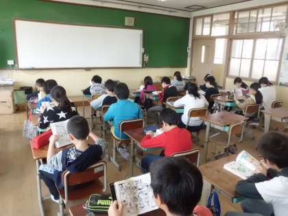 朝読書や給食の待ち時間に読書をしています。目標は全員が10,000ページを読破することです。1年間で全員が達成できるよう頑張っています。