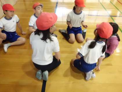 体育科「体ほぐし運動」で,グループごとに話し合いをしていました。どうすればうまくできるのか,どんな声かけをすればよいのか・・・