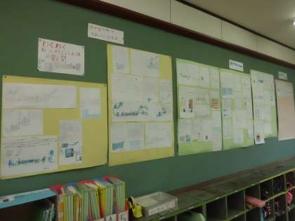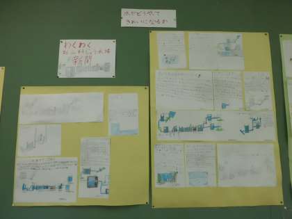 社会見学へ行って,わかったこと・発見したこと・思ったことなどを「わくわく新山科浄水場新聞」としてみんなでまとめました。みんなでたくさん記事を書いたので,教室の後ろの掲示板がいっぱいになりました。みんないろんなことに気付いていました。