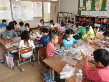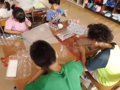 「光のプレゼント」」では,集めた材料を見たり実際に光を通してみたりしながら,どのような色にすると楽しいか,どんな形を作りたいかを考えグループで話し合いながら作りました。「きれい〜」「光るかなぁ〜」と言いながらみんな思い思いの作品を作っていました。次の時間には,実際に光を通してどのような形や色になるかみんなで造形遊びを楽しみたいと思います。