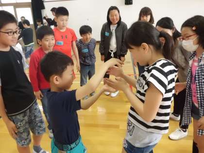 5月10日(水)の5・6時間目に「劇団ひまわり」の方に来ていただいて,演劇鑑賞の事前の学習をしました。まずはじめに「パントマイム」を教えてもらいました。何をしているのか分かりますか?