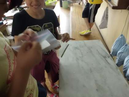 家庭科の時間にお茶の種類について学習しました。煎茶,ほうじ茶,玄米茶,抹茶の違いについて知りました。実際にほうじ茶と玄米茶の茶葉をにおい,かおりを比べました。子どもたちにとって玄米茶の方がなじみがあったようです。
