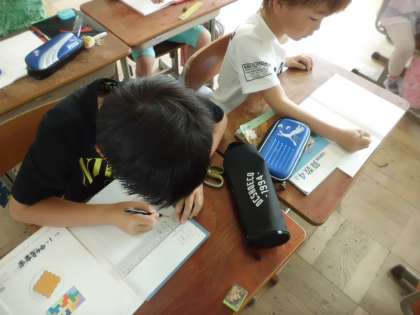 算数では「1けたでわるわり算の筆算」現在,学習しています。立てる→かける→引く→おろすを呪文のように唱えながら一生懸命練習しています。計算ミスをしないように!