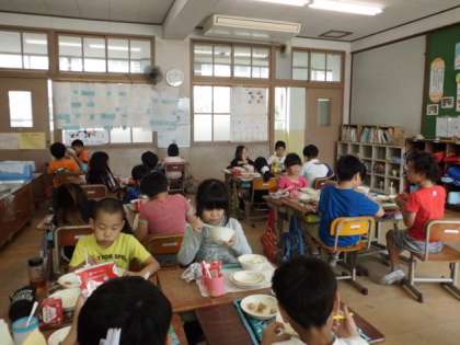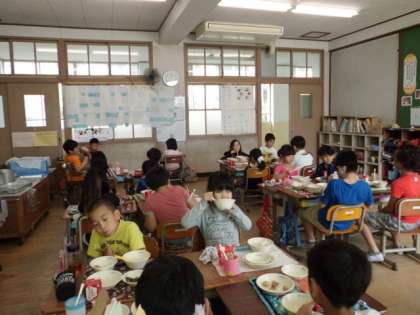 「もぐもぐタイムです〜」と声をかけるとおしゃべりをやめて,いっしょうけんめいに食べています。給食終了時刻の10分前からが「もぐもぐタイム」です。これからも時間内に食べられるように頑張りましょう。