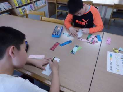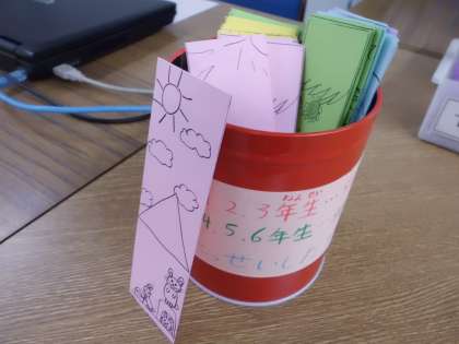 図書委員会でしおり作りをしました。123年は50冊,456年くすのきさんは30冊達成したら、手作りしおりがもらえます。図書委員がみんなのことを思って心を込めて作りました。みんなの反応が楽しみですね!