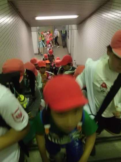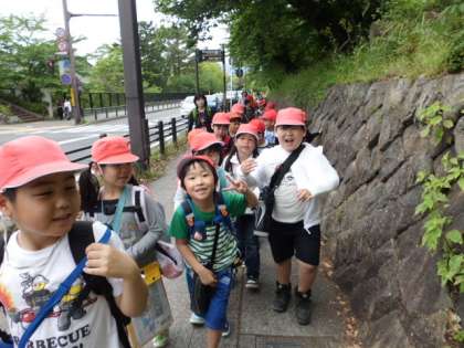 動物園に向かってきれいに並んで歩いています。道路の右側を歩いて,前の人と間をあけないように…動物園はもうすぐです。