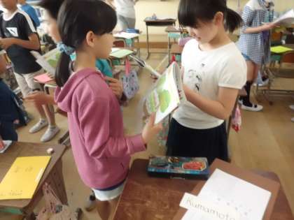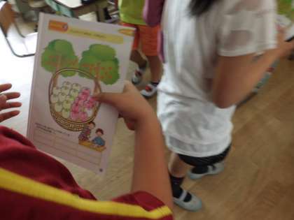 外国語活動で友だちにインタビューしました。「How many apples?」「Eleven!」と1〜20までの数の言い方に慣れました。いろんな児童にインタビューして同じ数の児童を見つけていきました。「Ten!」と答えた児童が一番多かったようです。