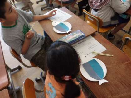 魚を上手に食べるには,まず魚の身の真ん中をおはしではさむように筋を入れ,それから身をほぐして食べること。また,魚を食べると頭がよくなったり,血の流れがよくなったり,骨がつよくなることなどを教えていただきました。魚をたくさん食べてじょうぶな体になって欲しいです。