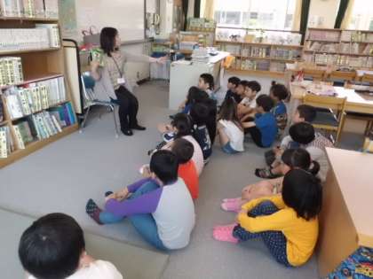 今日は図書館へ行きました。図書館では「なにのこどもかな」「どうやってねるのかな」の2冊の本を読んでいただきました。一昨日動物園に行ったばかりのみんなは,動物のお話に興味津々でした。その後は,図書館にある動物の本を一人一人読みました。みんな真剣に読んでいましたよ。