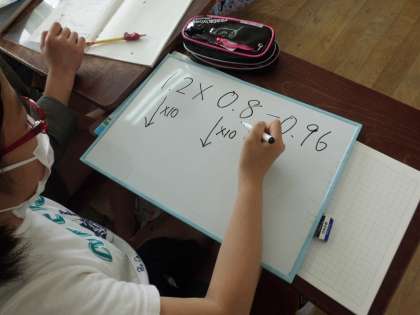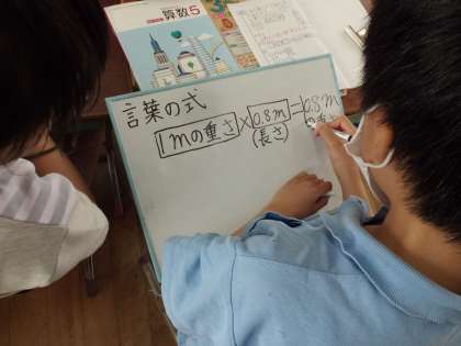 算数科「小数×小数」で,計算の方法を考えました。自分が考えたことを3人グループで話し合い,小さなホワイトボードにまとめています。そのホワイトボードをもとに全体でまとめました。みんなで考えるといろいろな意見が飛び交い,とても有意義な学習になりました。