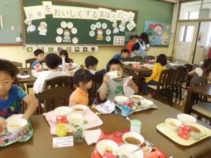 ランチルームへ行きました。「今日はランチルームへ行きます」と伝えると「やった〜!!」と大喜びのみんな。きれいな椅子と机があるランチルーム。みんなの大好きなランチルームでの給食の時間でした。