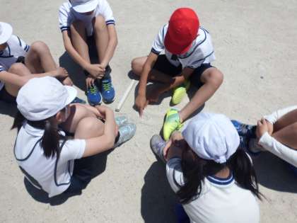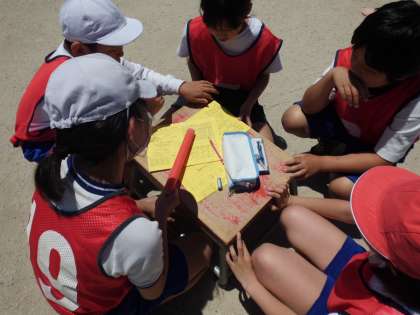 体育科「リレー」の学習も6時間中5時間目になりました。赤・白・黄・青の4チーム中1回も負けたことがないのが絶対王者白チームでした。今日は赤VS白で1レース目は最後のアンカー勝負になり,絶対王者白チームが差し切りました。2レース目,赤チームは走順をどうするか話し合っています。白チームはコーナーの走り方やバトンの渡し方について話し合いました。