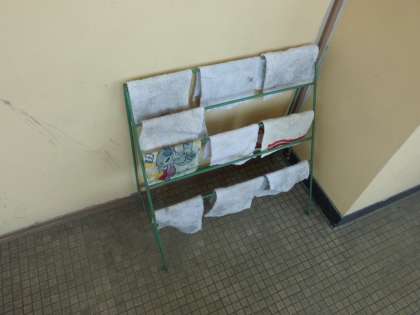 風の強いある日,ろうかのぞうきんが風で散乱していました。担任も荷物を両手に持ち,急いでいたので「あとで直そう」と思って通り過ぎました。すると,次に通った時には写真のようにきれいにかけてありました。気がついた誰かがきれいにかけてくれたのです。素敵だなぁと思い,つい写真を撮りました。ちょっとの余裕があるとこういうことに気付いて行動に移せますね。