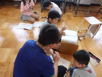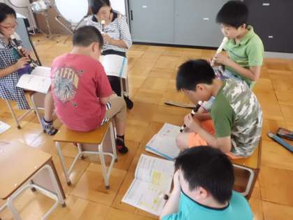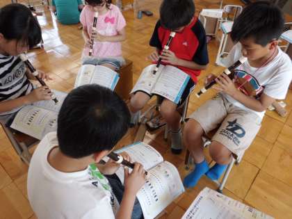 班ごとに分かれてリコーダーを練習しています。パートに分かれて旋律の重なりを楽しんでいます。