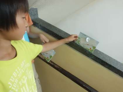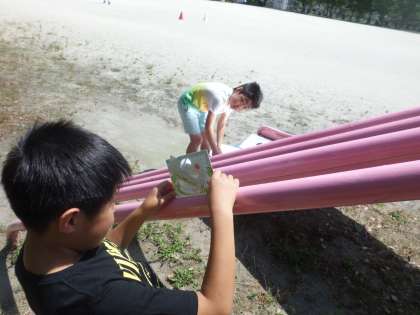 算数で分度器ではかりにくい傾きを「かたむき分度器」を使ってはかりました。様々な場所の傾きを予想した後,実際にはかりました。階段の手すりやすべり台などいろいろな場所をはかりました。「意外に角度が急だなぁ」などと感じていました。