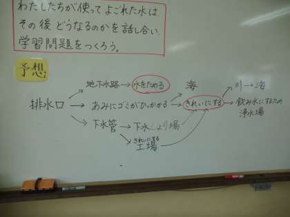 社会の「くらしと水」という学習で,いつも使っている水がどのようにしてきれいにされてわたしたちのもとへくるのかを調べてまとめることができました。その後,「じゃあ,使った後の汚れた水はどうなるんだろう?」という新たな疑問がうまれました。そこで,次の学習として汚れた水はどうなっているのかを予想しました。写真はその時の板書の様子です。ここから石田小学校4年1組の学習問題として「わたしたちが使ってよごれた水はどこに行って,どのようにきれいにするのだろうか」と設定しました。今後はこの学習問題について調べていきます。