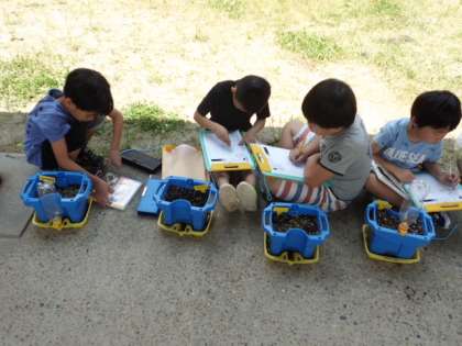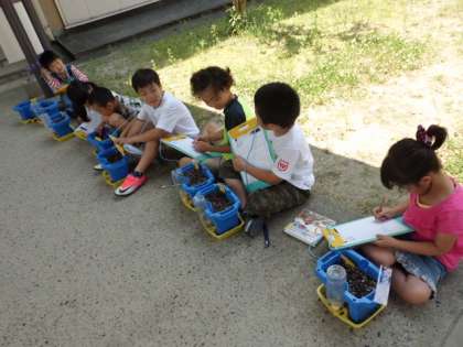 ミニトマトの観察をしました。「こないだ芽がでたとこなのに,こんなに大きくなってる!!」「2センチもある!」と興奮しながら観察しました。どんどん大きく成長していくミニトマトです。