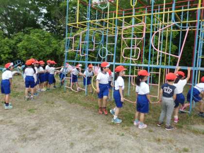 今日は,みんなで一列になって総合遊具の探検をしました。