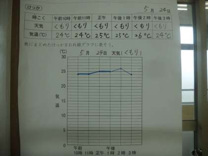 理科の「天気と気温」の学習をしています。晴れの日とくもりの日のちがいを話し合ったら,「晴れの日の方が暖かい」「お昼ごろに暖かくなる」ということに気付きました。そのことが合っているか調べるために,晴れの日とくもりの日の10時から3時の気温の変化を調べることにしました。早速今日がくもりだったので,気温の変化を調べました。次は晴れの日に調べたいと思います。