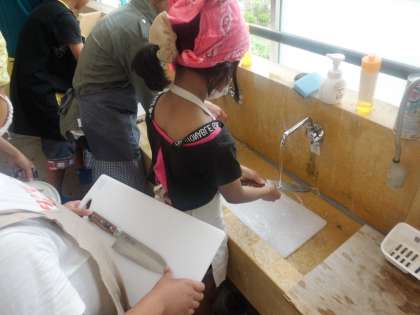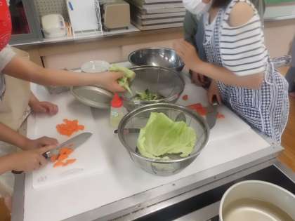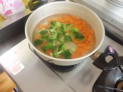 調理をする時にはおいしく調理することも大事ですが,安全にも十分に注意することはもっと大事です。野菜を切る時には猫の手にして添えます。茹でる順番はニンジンが最初で,沸騰してからブロッコリーを投入!火をとめる前にキャベツをさっと茹でて出来上がり!!待っている間祈っています。おいしくなあれ!おいしくなあれ!!