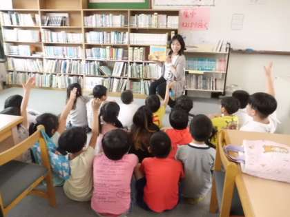 図書館で学習しました。図書館では「パンダのびっくりプレゼント」という本を読んでいただきました。その後は,読書ノートを使って,図鑑で調べたい時はどのように調べたらよいのかを教えていただきました。真剣にお話を聞いていた2年生でした。