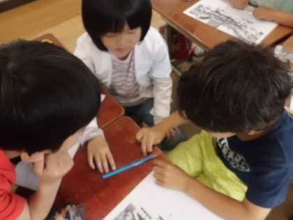 「○○のいくつ分」と数える練習をしました。その後には定規ではがきの長さをはかりました。今後は何センチだけでなく,何ミリなのかもはかる練習をしていきます。