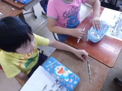 算数の学習では,数図ブロックやクリップを使って,鉛筆の長さをはかりました。
