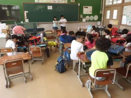 5時間目が終わると,終わりの会です。授業が終わってからは,3分間で帰る用意をして終わりの会を始めます。みんながてきぱき行動すると3分でも余裕があります。