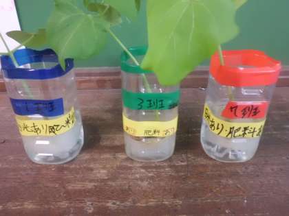 植物が成長するのに,日光や肥料が関係あるのかを調べています。毎日肥料が必要な物には肥料をあげて,日光を当てないものには箱をかぶせて観察しています。どんな違いがでるのか楽しみですね。