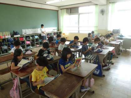 掃除が終わり少し遅れて教室に行く途中,いつもなら階段をのぼっている時にざわざわと声が聞こえるのに,今日は聞こえませんでした。どんどんのぼっていても物音ひとつしません。「あれ?体育で運動場に行ったのかな?でも体育は6時間目やけど…」と思って教室に入ったら,なんと写真の状態でした。担任を待つ少しの間にみんなが読書をしていたのです。思わず写真を撮っていました。読書に親しむ姿が増えたこと,担任がいないからといって騒がず自分たちのすべきことをしていたことに感動しました。