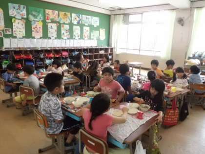 おかわりをする子もたくさん,みんなおいしいおいしいとパクパク食べていました。食缶はきれ〜にからっぽになりました。