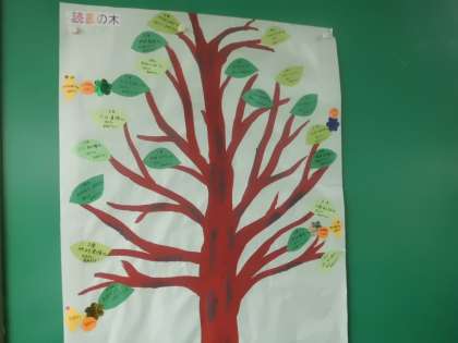 みなさん図書館前に貼ってある木をご存知でしょうか?子どもたちが読書を頑張れば頑張るほど実っていく木です。高学年では5,000ページごとに葉が出て成長していきます。5年生では,早くも4人の児童が5,000ページを越えて名前を連ねています。全員の名前が載る日がきっとくることでしょう。