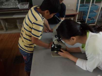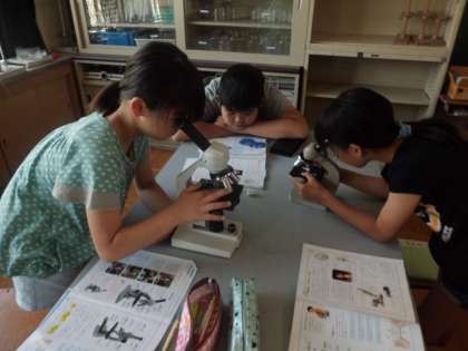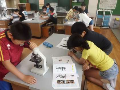 理科の学習で顕微鏡の使い方を学習しました。見たいものの置き方やピントの合わせ方などを聞き,いざ覗いてみるとビックリ!!「文字が逆向きになっています!」,「塩がむっちゃでかいです!」など驚きの声が聞かれました。これからいろいろな物を顕微鏡で見るのが楽しみな様子でした。