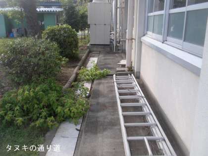 夜に山から下りてきて??学校の東側に隣接しているお墓のお供え物を食べるそうです。それもわざわざ学校のグリーンゾーンに持ってきて食べているとのことです。そういえば,いつも包み紙や食べかすが落ちています。そして運動場で「うんち」をするようです。