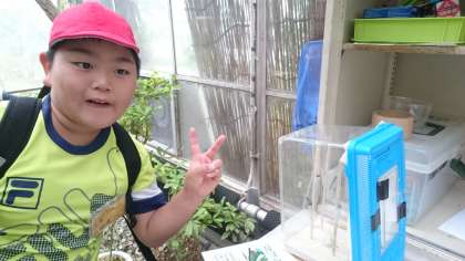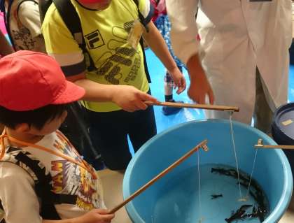 生き物コーナーで生き物と触れ合って楽しんでいます。