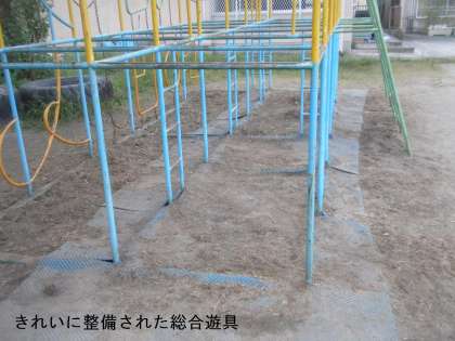 総合遊具の地面に雑草が生えてかたくなっていました。安全のために雑草を抜いて地面を柔らかくして,そして土に埋もれていた安全マットを敷きなおしていただきました。いつもいつも浦上さんありがとうございます。