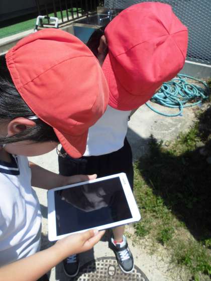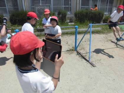 鉄ぼうでいろいろな技に挑戦しています。ペアで,タブレットで動画をとってもらい,チェックしながらどこを修正したらよいかを話し合っています。自分の動画を見ることで,イメージもしやすくなりますね。