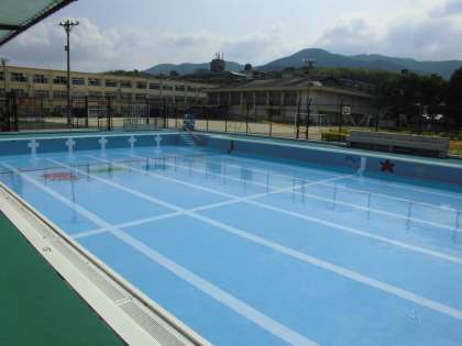今年のプールはピカピカ♪子どもたちが安全に楽しく水泳学習ができるように,教職員でプールの底,ラインのペンキを塗りなおしました。
