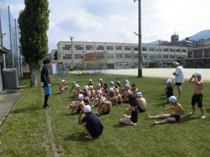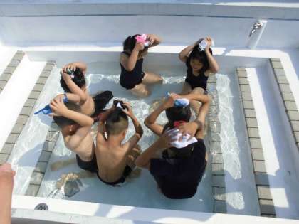 準備体操から始まり,足洗いをして腰洗いをしています。カエルの歌を一曲歌うまでつかります。「か〜え〜るのう〜た〜が〜♪」子どもたちの声が聞こえてきます。早く入りたいとうずうずな子どもたち…